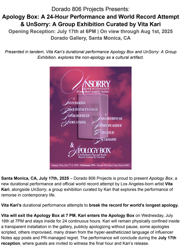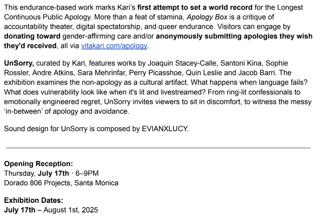 For 24 hours, Vita Kari will remain confined, reciting anonymous public apologies non-stop. It’s a world record attempt and a fundraiser for gender-affirming care.