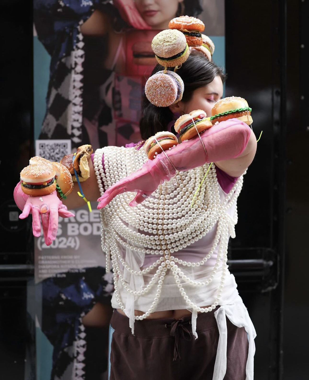 Burger as Body (2024) is a performance piece by Vita Kari that took place on Monday February 12th 2024 from 3pm - 6pm, outside of NYFW.